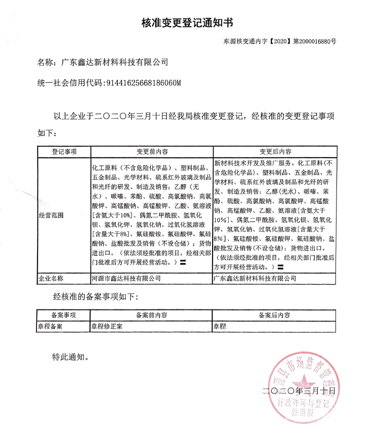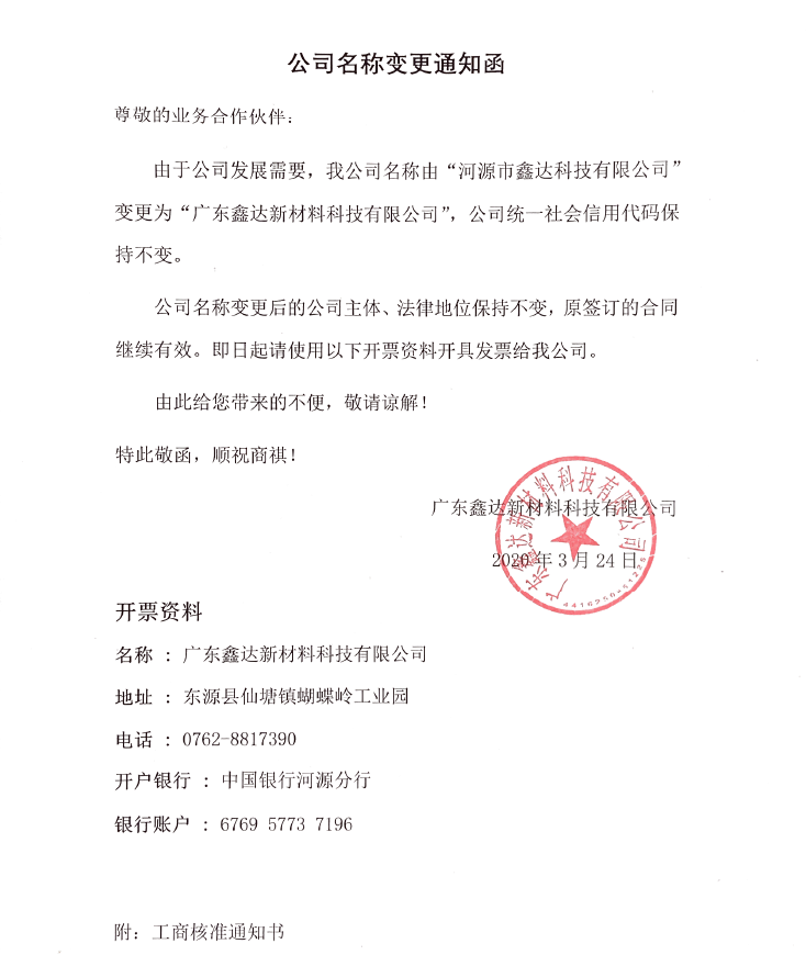 由于業(yè)務(wù)發(fā)展需要,我司公司名稱已由“河源市鑫達(dá)科技有限公司”變更為“廣東鑫達(dá)新材料科技有限公司”,公司統(tǒng)一社會信用代碼、地址、聯(lián)系電話等信息不變,公司名稱變更后的公司主體、法律地位保持不變。鑫達(dá)將繼續(xù)與公司的合作伙伴攜手共進(jìn),再創(chuàng)輝煌!
