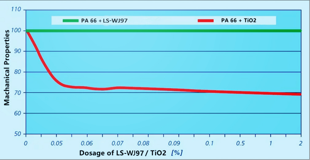 - Mixing with TiO2, PA66 glass fiber reinforced will significantly reduce its mechanical properties. However, using Zinc Sulfide LS-WJ97 to replace TiO2, the mechanical properties are well retained.
